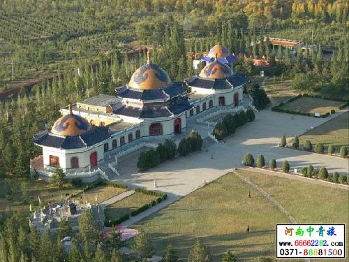 成吉思汗陵位于鄂尔多斯市伊金霍洛旗境内,现今的陵园建于1954年,是全国重点文物保护单位之一。成吉思汗陵墓规模宏大,建筑雄伟,整个陵宫犹如一只冲天而飞的雄鹰,翱翔在辽阔的草原上。